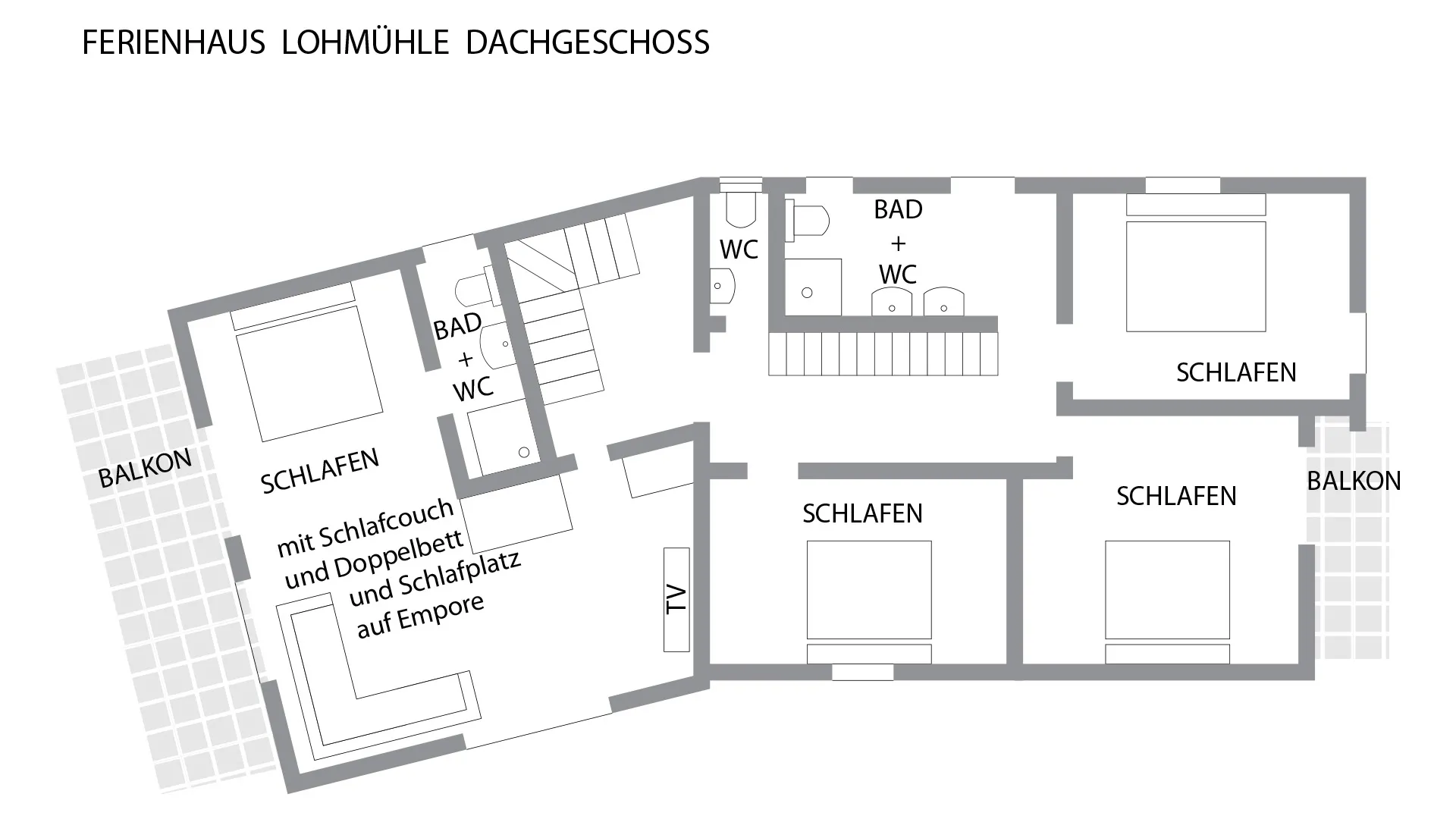 Grundriss des Obergeschosses vom Schwarzwald Chalet Lohmühle mit Schlafzimmern, Balkonen und Badezimmern.
