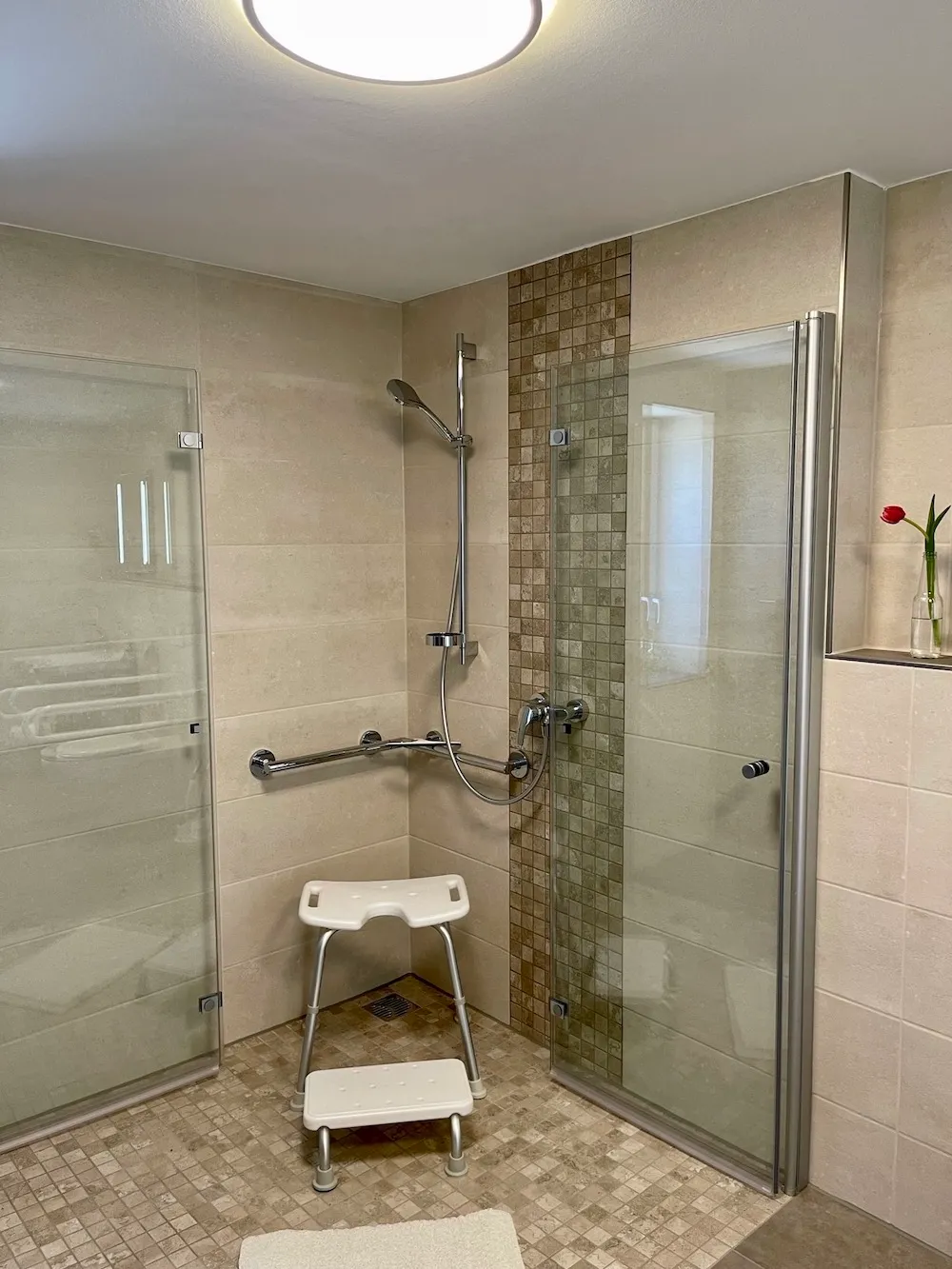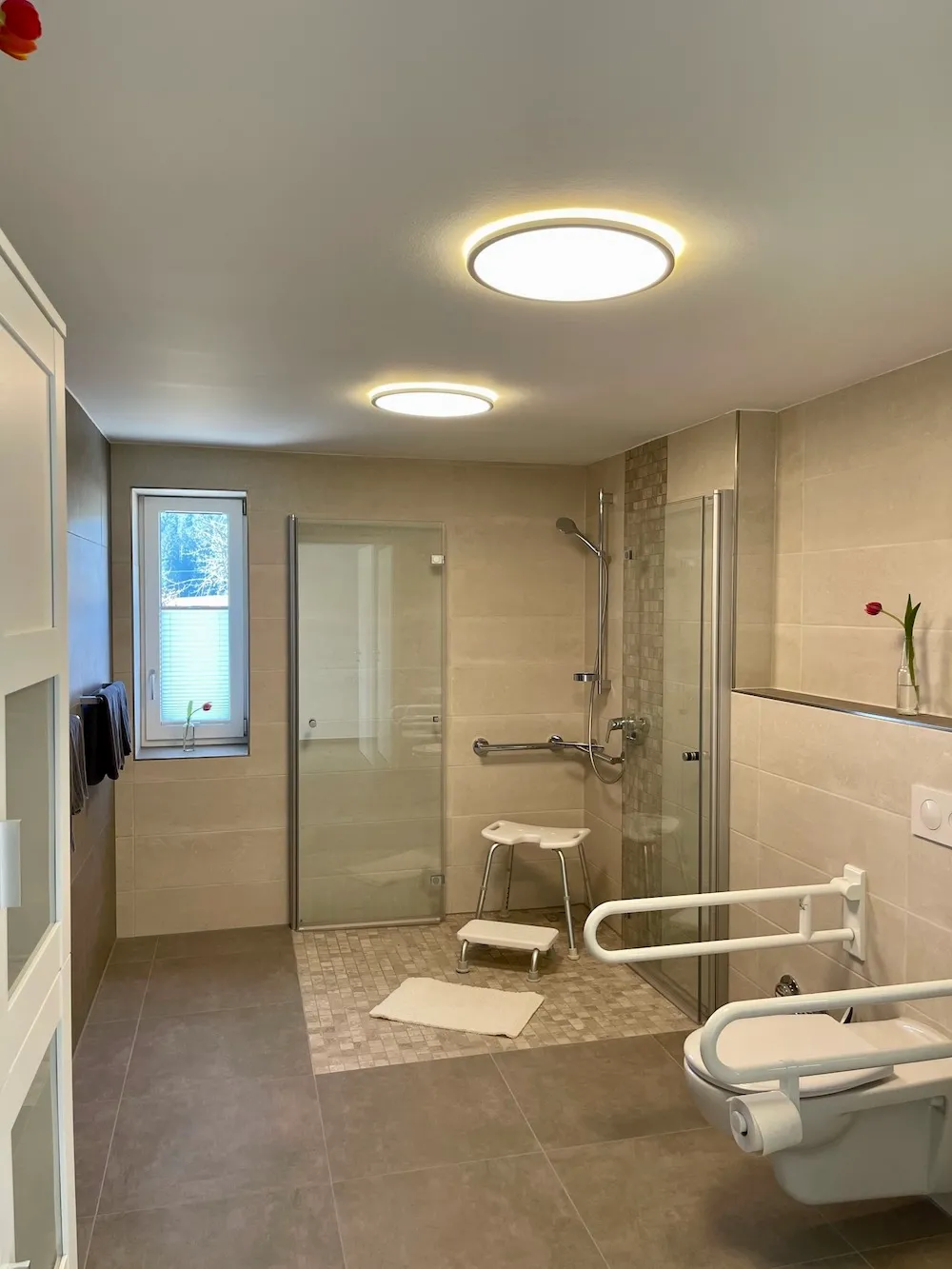 - großes, geräumiges rollstuhlgerechtes Bad mit Dusche, Föhn und WC (Stützgriffe)