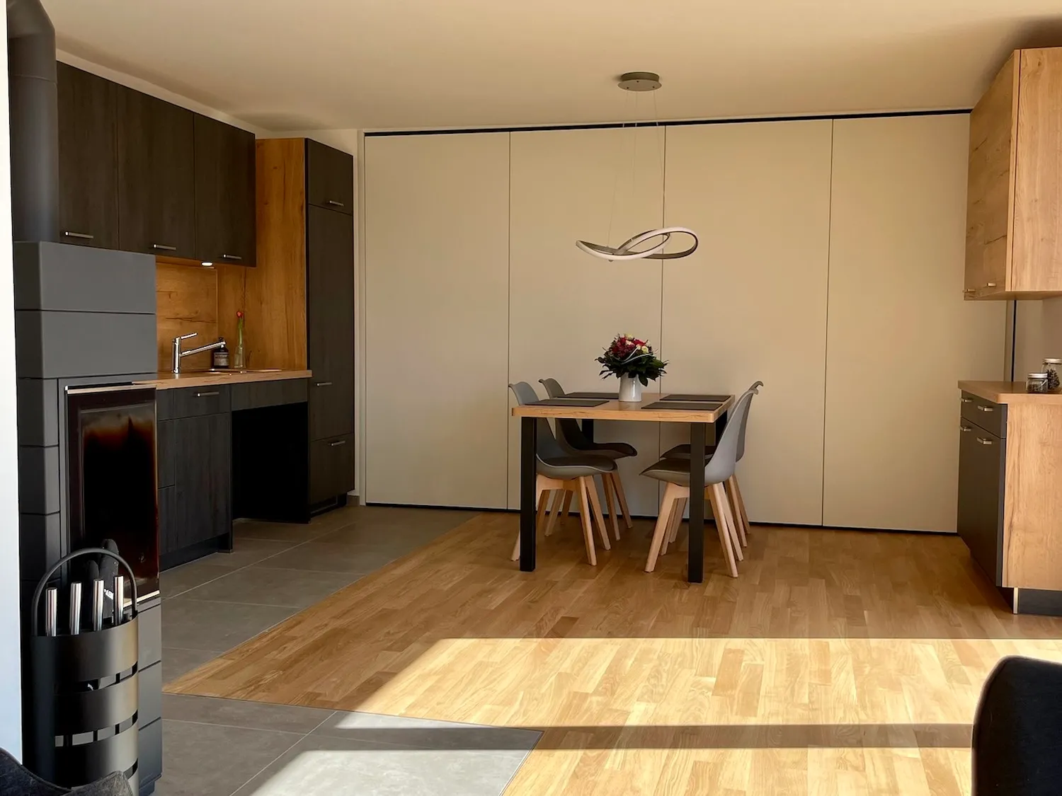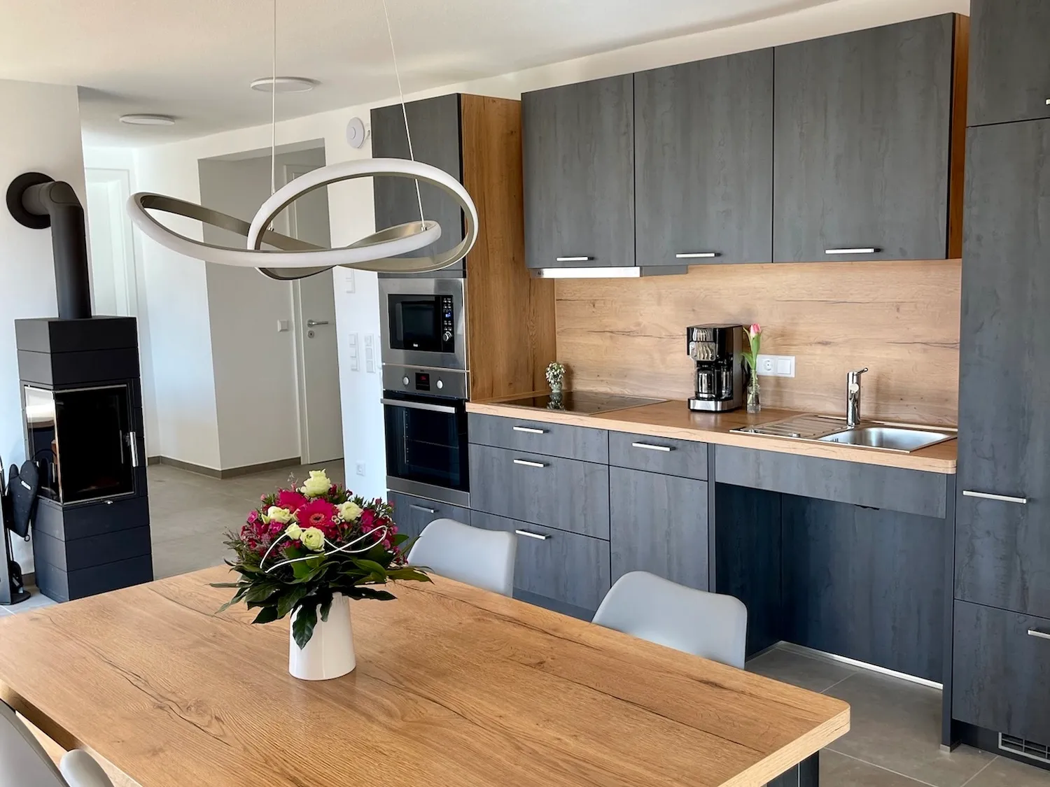 Eine ruhige Lage, helles und modernes Ambiente, zusammen mit einer voll ausgestatteten und modernen Küche, gemütlichen Schlafzimmern, ein Schwedenofen im Wohnzimmer und ein Bad mit Dusche bieten alles, was Sie für einen entspannten Aufenthalt benötigen.